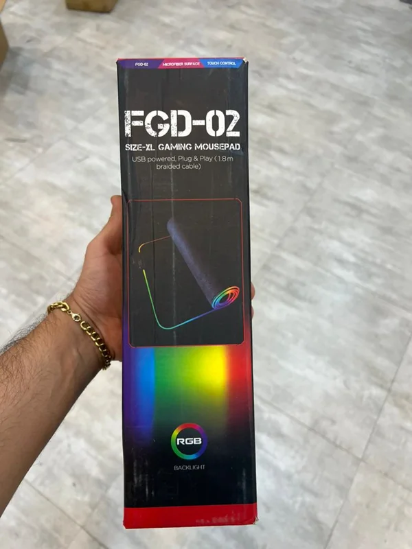 وس پد گیمینگ مدل FGD-02 با ابعاد بزرگ 40x90 یک وسیله بسیار عالی و جذاب برای گیمرها میباشد این موس پد با نوار نورانی RGB که اطراف خود دارد و میتواند تا 10 طیف رنگی تغییر کند میز کامپیوتر شما را زیبا و جذاب میکند همچنین ضخامت 4 میلی متر این محصول بر کیفیت آن افزوده است