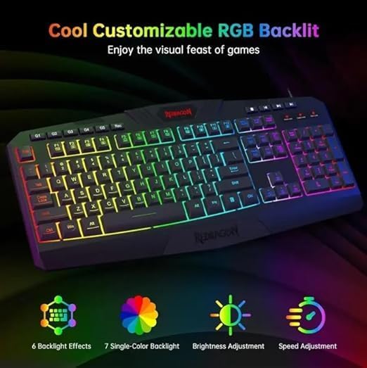 کیبورد موجود در ست Redragon S101-BA-3 با نورپردازی RGB خود متمایز میشود که شش حالت و افکت نوری مختلف را ارائه میدهد. کاربران میتوانند روشنایی نور پسزمینه را در چهار سطح تنظیم کرده و همچنین سرعت جابهجایی افکتها را کنترل کنند.