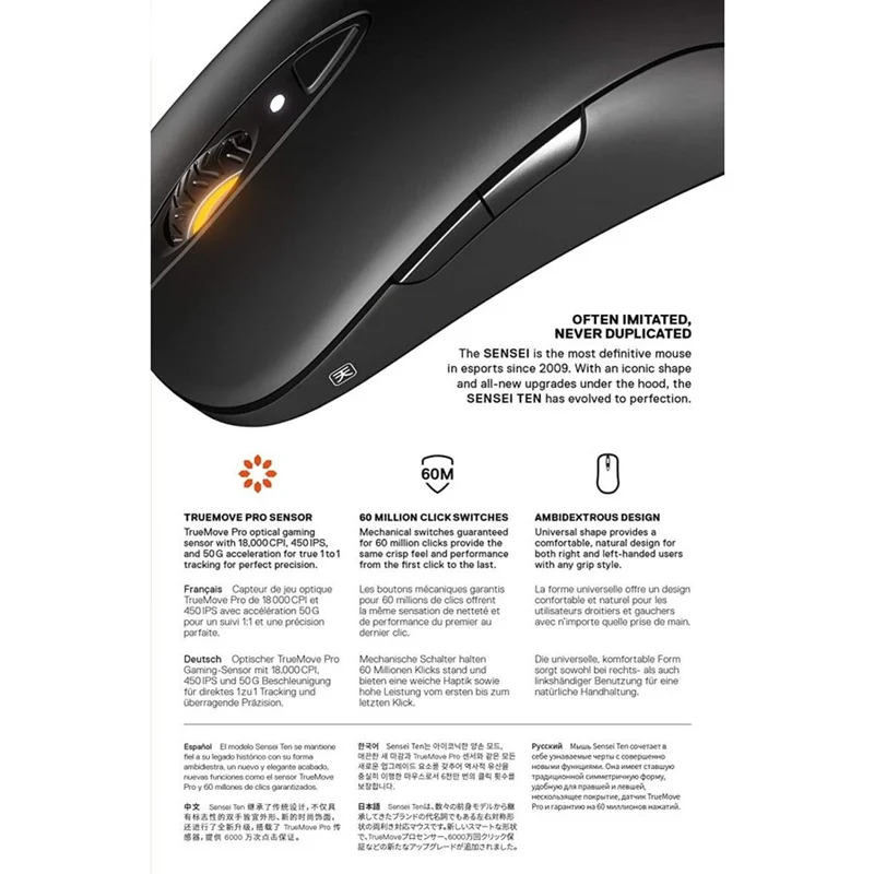 Steel Series از ماوس گیمینگ جدید خود با نام Sensei 10 رونمایی کرده و هم زمان آن را به بازار عرضه کرد. Sensei Ten از سنسور جدید شرکت یعنی TrueMove Pro بهره میبرد که در همکاری نزدیک با PixArt طراحی شده است. نتیجه این همکاری باعث شده سنسور مذکور بتواند حرکات 1:1 را به بهترین شکل دریافت کند. دقت 18000CPI و سرعت ردیابی 450 اینچ بر ثانیه (IPS) از مشخصات این مدل هستند.
