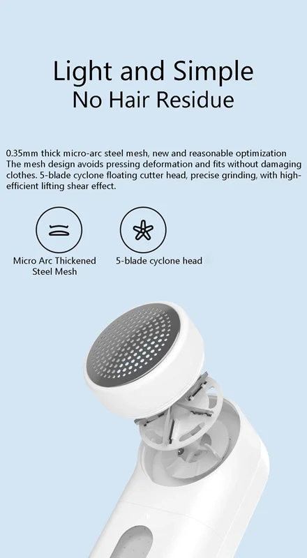 پرزگیر لباس میجیا شیائومی دارای مش فولادی میکرو قوس ضخیم 0.35 میلیمتری است. طراحی مش به طور منطقی بهینه شده، که به پارچهها آسیبیی نمیرساند، به علاوه نیازی نیست هنگام استفاده دستگاه را روی سطح هشار دهید. 5 پره دقیق درون دستگاه برش را با راندمان بالا انجام میدهند.