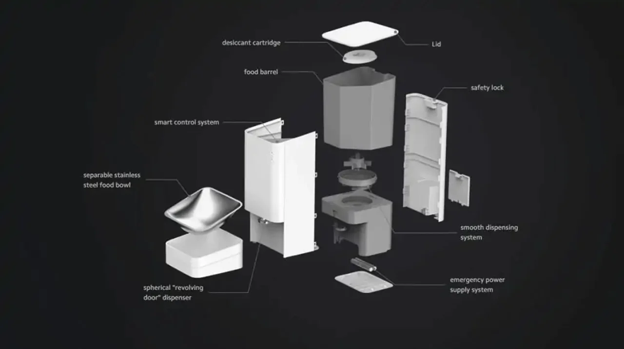 محفظه غذا، همزن غذا، تیغه توزیع و کاسه غذا از جنس فولاد ضد زنگ 304 ساخته شده اند جنس ظرف غذا این امکان را به شما میدهد که به راحتی تمیز شود .چربی غذا روی آن باقی نماند علاوه بر این موضوع به ادعای شیائومی مخزن غدا به خوبی میتواند غذا را تا 20 روز تازه نگه دارد.در جلوی دستگاه یک چراغ نشانگر کوچک وجود دارد که به شما امکان می دهد از اتصال دستگاه به وای فای مطلع شوید.