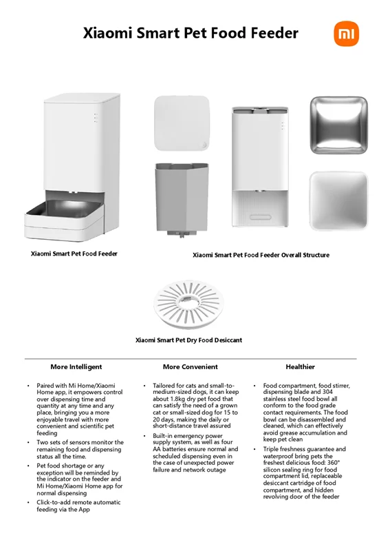 تغذیه کننده هوشمند میجیا به طور خاص برای گربه ها و سگ ها ساخته شده است ، مخزن آن به راحتی می تواند 1.8 کیلوگرم غذای خشک را در خود جای دهد که برای یک گربه بالغ یا سگ کوچک به مدت 15-20 روز کافی است.این دستگاه انرژی لازم خود را از برق تامین میکند اما چهار باتری AA نیز داخل دستگاه قرار می گیرد تا در صورت قطعی از آن استفاده کند.