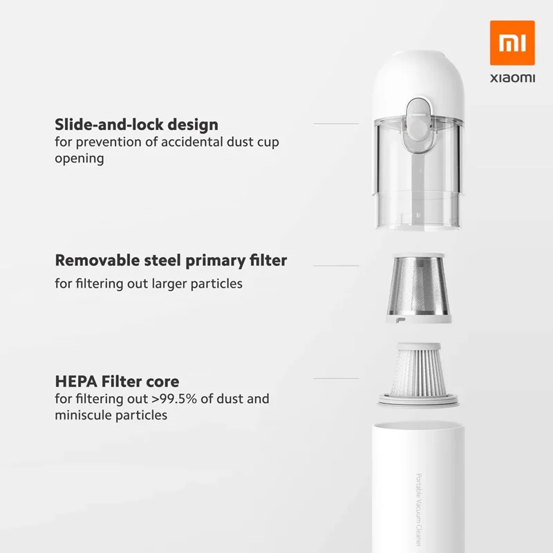 جارو برقی کوچک شیائومی Mi Vacuum Cleaner Mini مدلی بسیار کوچک و جمع و جور بوده که تنها در حدود 500 گرم وزن دارد و برای جا به جایی و جارو کردن اتومبیل بسیار کاربردی و مناسب می باشد. قدرت مکش آن 13000 پاسکال (در مدل 120 وات) بوده که در حدود 96 درصد ذرات را جارو می کند. این جارو برقی دارای دو حالت مکش بوده که شما استاندارد و پر قدرت می باشد که متناسب با استفاده ی خود می توانید آن را انتخاب کنید